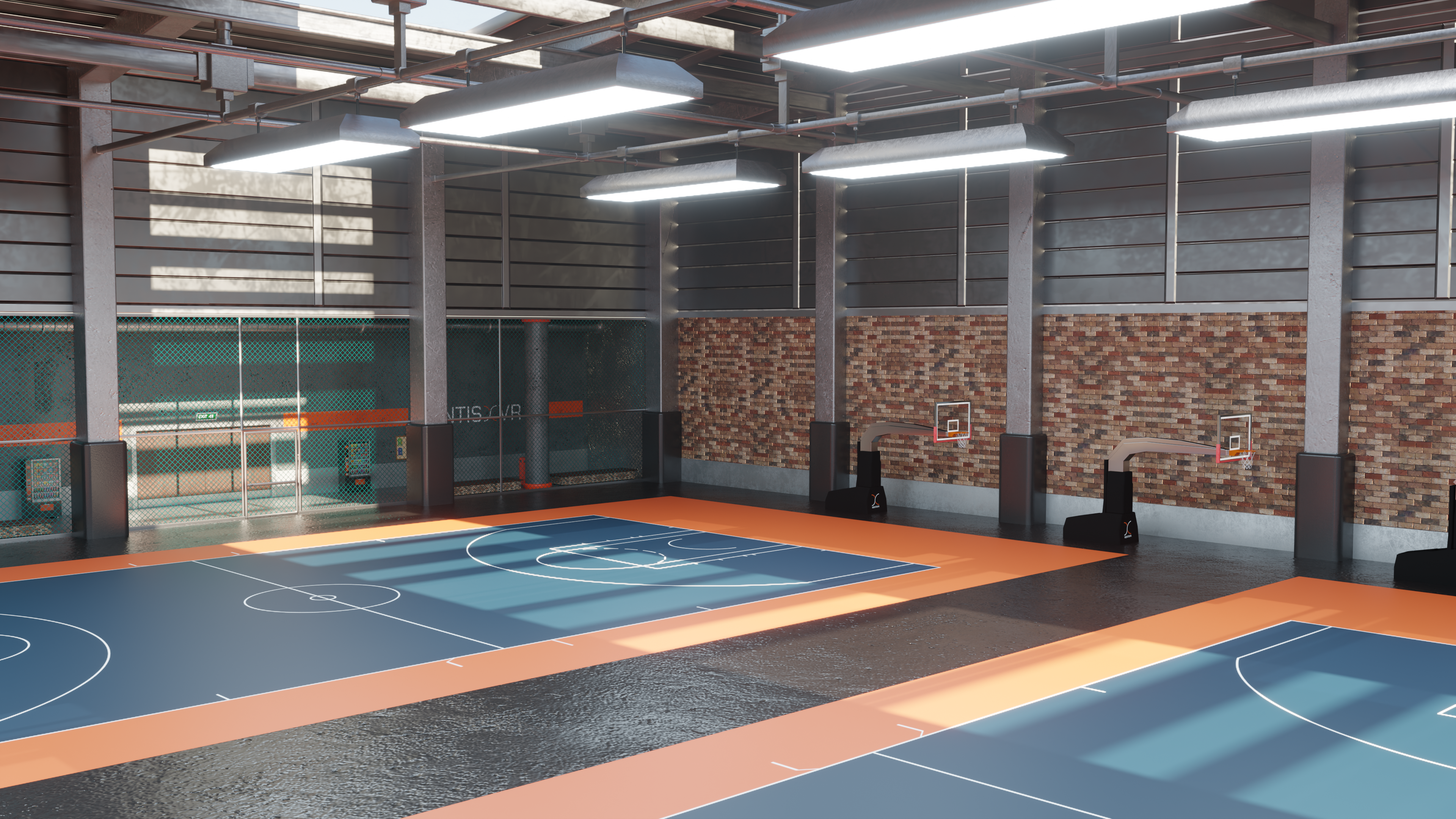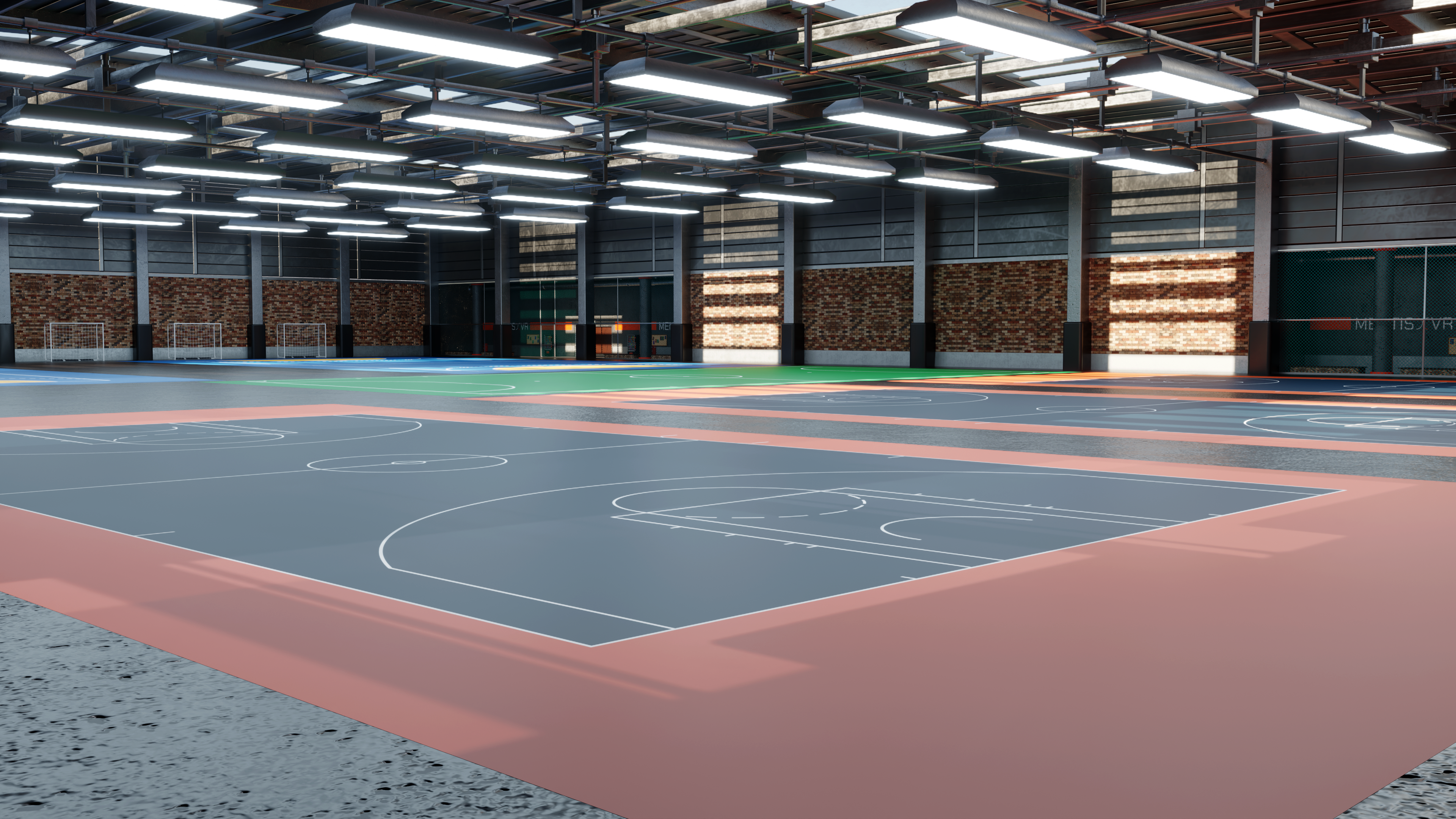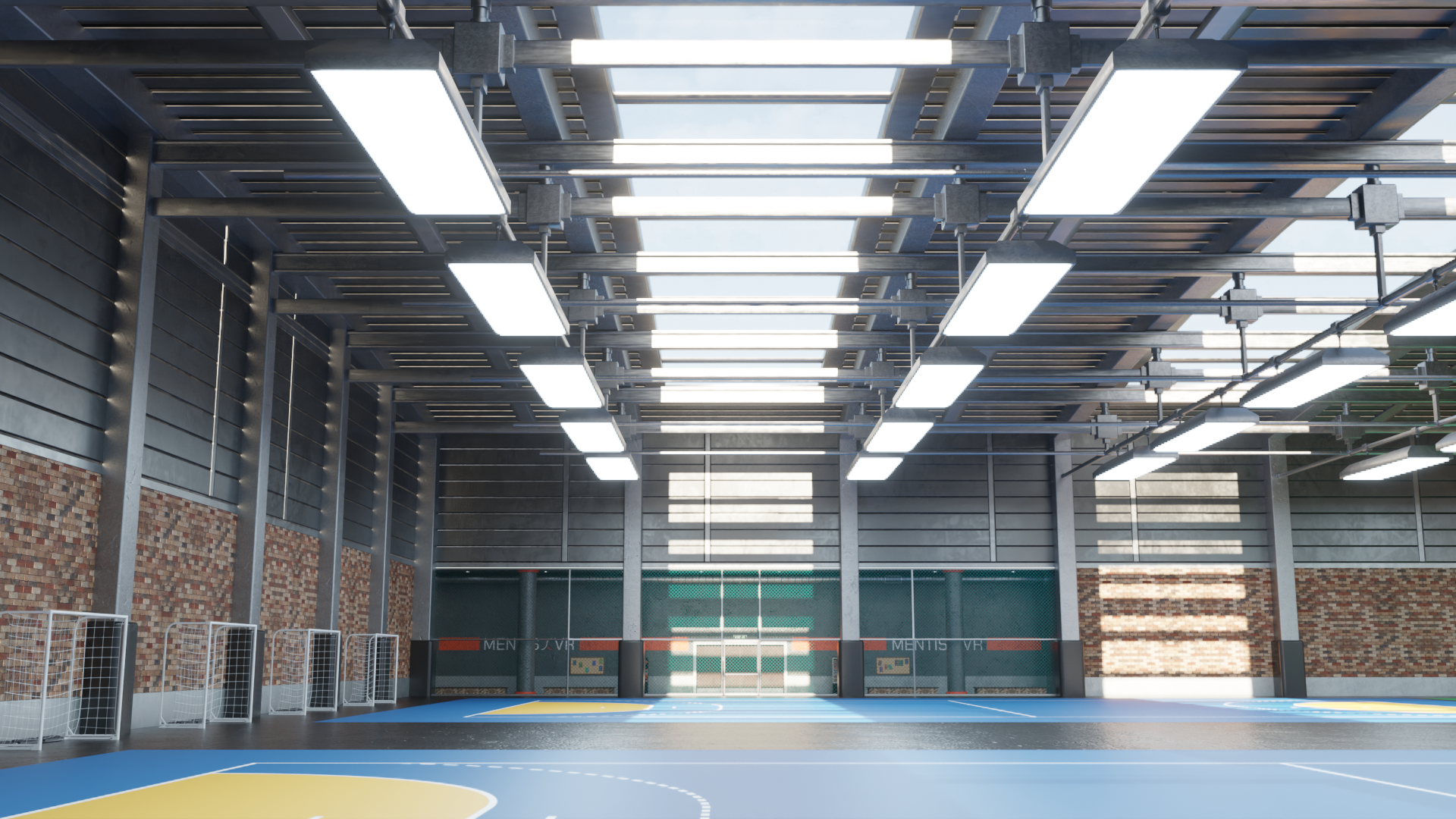 This was my last assignment as part of the Mentis VR team. I fully designed and modeled the environment following the specifications of the leadership team. The space had to be enclosed and large enough to fit several courts from a variety of sports, including a full football field. I gave the space a "converted warehouse" aesthetic and I added a few skylights to bring in some natural light to avoid the space feeling claustrophobic. Unfortunately I was unable to complete its implementation from Blender to Unity.